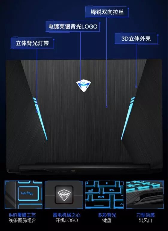 【独立设计,反重力金属美型战舰】全新机械师F117-V「猎鹰」,钻石切割锐利纤薄,让你拿出手就是整条街最靓的仔!A壳采用拉丝工艺搭配蓝色发光LOGO和立体灯带,“RGB”灯光效果扩散至尾部出风口。尺寸轻薄至22mm!线下开黑与移动办公都更加便捷。