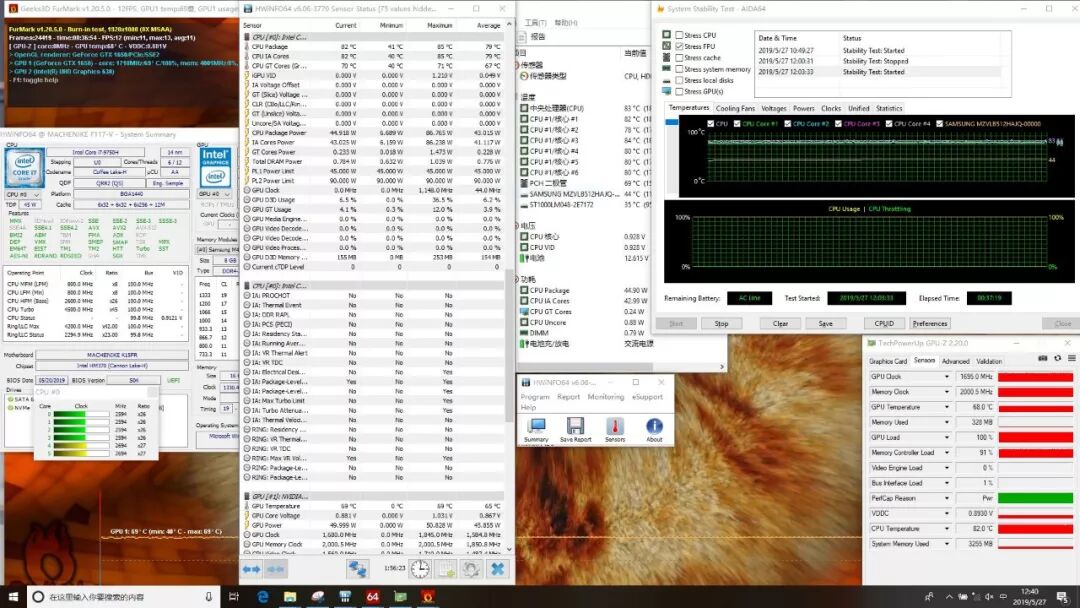 本文转载:笔吧评测室 机械师在笔吧评测室接触相对较少,一开始是通过天猫孵化的游戏硬件品牌。 时近618,机械师在发布九代U与16系显卡的同时,也在官网开启了优惠活动。 今天要和大家点评一下的是机械师的新品F117-V,这是一台主打RGB灯效与A面金属材质的窄边框游戏本。 拥有RGB灯效的它表现如何? 散热性能又能否满足主流硬件呢? 今天我们就来简单分析一下: 机械师F117-V 机身左侧 机身右侧 机身后部 它的配置如下: i7-9750H 处理器 GTX1650 4GB 独立显卡 16GB 内存 512GB 固态硬盘 1TB 机械硬盘 15.6英寸 1080P分辨率 72%NTSC色域 IPS屏 厚 25.5mm 机身重 2.2kg 适配器重量 500g 官网售价7199元 它的优缺点如下: 优点! 1,散热表现较好 2,键盘键程较长,手感不错 3,标配双通道16G内存,且硬盘容量较大 缺点! 1,高负载下噪音较大,强冷模式更大 2,摄像头位置在转轴处 3,实测屏幕色域覆盖80.3%sRGB,较小 【升级建议】 这台笔记本电脑拆机有点麻烦,卸下底面螺丝后,要先把机器尾部的外壳取下,再拧下底面一颗被外壳遮挡住的螺丝后,才能取下底盖。 双通道16GB内存能够满足大部分用途的需要,如果有特殊需求可自行更换内存。 固态硬盘是512GB的三星PM981,支持PCIe 3.0 x4和NVMe,如有需要可自行更换固态硬盘。 【购买建议】 1,对键盘手感有一定要求 2,对散热效能有一定要求 3,能够忍受较高的满载噪音 这台笔记本电脑最大的特点是它的存储配置了,标配16G双通道内存,省去到手升级的步骤,512GB固态+1T机械存储作为游戏本也是能塞不少3A大作了。 官方的一个宣传亮点是这台机器的RGB灯效配置,除了A面的两条RGB灯带外,它的出风口处,还有两条被称为“RGB智能氛围灯”的部件,根据风扇的转速改变灯光,可以更直观感受到散热的工作状况。 F117-V的键盘除了搭载4分区RGB背光,键程也比较长,打字时的体验还不错。 这台机器散热时风扇转速较高,它的满载人位分贝值为52.6dB,开启强冷后达到56.6dB,噪音较大,游戏时若不顶到满负载,那实际噪音会低一些。 屏幕方面,它的实测色域容积为92%sRGB,色域覆盖为80.3%sRGB,平均△E为3.24。 如果你想要一台到手就能用,不太需要升级的游戏本,那么这台笔记本在天猫首发,6月1日凌晨0点至1点最低6999元,就1小时有这价格。 但如果你希望外观简约低调一些,那么这台电脑可能不太适合你。 【猪王的良心结语】 上图是机械师F117-V的拆机实拍图,3热管双风扇的组合。该模具和戴尔G7一样由和硕代工,内部比较相似。 室温25℃ 反射率1.00 BIOS版本:S04 PS:机器为工程机,使用了QS版的i7-9750H。 在满载状态下,CPU温度最高82℃,功耗45W,频率在2.6~2.7GHz波动。 显卡温度最高68℃,功耗50W,频率1695MHz。 表面温度如上图所示,键盘键帽温度最高为44.4℃,WASD键位区域在33℃附近,方向键37.2℃。左腕托温度为27.2℃。